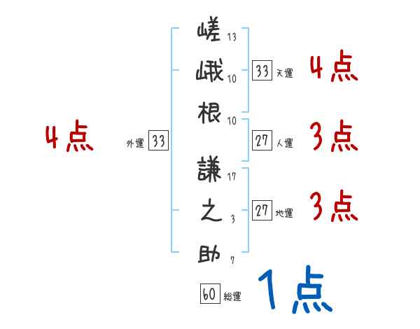 外運![]() | 嵯峨根謙之助さんの外運は33画の4つ星!権力志向でプライドが高い。勇気があり運を切り開き成功する。 生活面を象徴する運勢です。外部から受ける影響力を表し、結婚運、家庭運や職場、環境への順応性を表します。 |