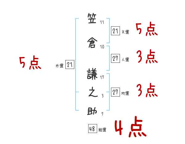 天運![]() | 笠倉謙之助さんの天運は21画の5つ星!統率力がある。独立し成功する。名誉を手に入れる。 家系が持つ宿命的な運勢を表します。祖先から受け継いだ苗字ですので自分の力が及びません。家柄を象徴します。 |
