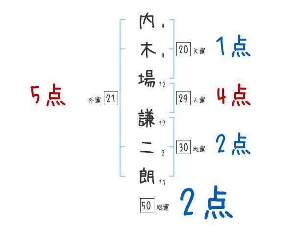 外運![]() | 内木場謙二朗さんの外運は21画の5つ星!統率力がある。独立し成功する。名誉を手に入れる。 生活面を象徴する運勢です。外部から受ける影響力を表し、結婚運、家庭運や職場、環境への順応性を表します。 |