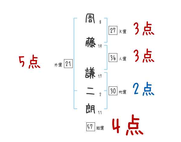 外運![]() | 周藤謙二朗さんの外運は21画の5つ星!統率力がある。独立し成功する。名誉を手に入れる。 生活面を象徴する運勢です。外部から受ける影響力を表し、結婚運、家庭運や職場、環境への順応性を表します。 |