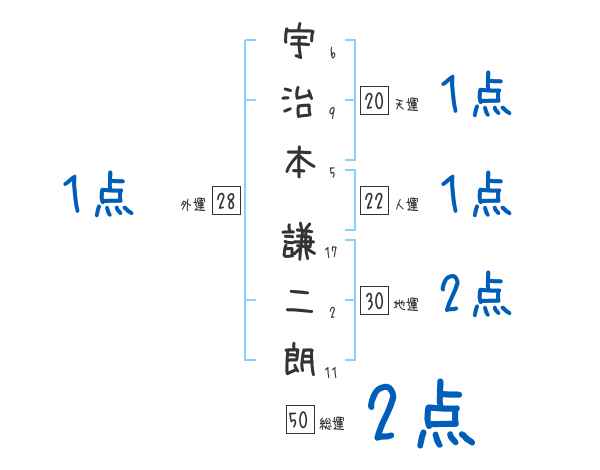人運![]() | 宇治本謙二朗さんの人運は22画の1つ星!努力することが苦手ないっぽう手先が器用。芸術性にも優れる。 性格や才能などを表す2番目に重要な運勢です。人間関係や協調性、社会的な成功に影響します。主に20歳から50歳ぐらいまでの中年期の運勢を表します。 |