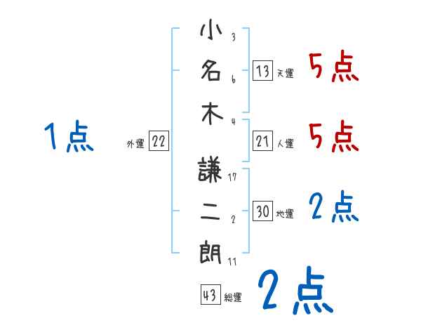 人運![]() | 小名木謙二朗さんの人運は21画の5つ星!統率力がある。独立し成功する。名誉を手に入れる。 性格や才能などを表す2番目に重要な運勢です。人間関係や協調性、社会的な成功に影響します。主に20歳から50歳ぐらいまでの中年期の運勢を表します。 |