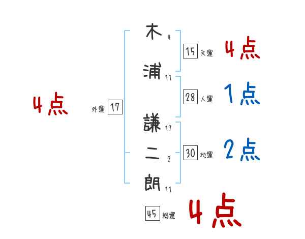 総運![]() | 木浦謙二朗さんの総運は45画の4つ星!もくもくと物事を進め達成する。地味な努力家。 あなたの人生を表す1番重要な運勢です。生涯を通じて影響する総合運となり、主に50歳以降の晩年期に影響を及ぼします。 |