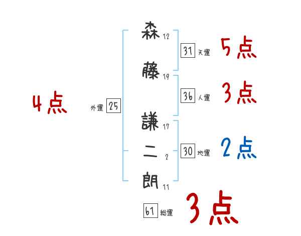 外運![]() | 森藤謙二朗さんの外運は25画の4つ星!個性があり才能があふれる。強運の持ち主で発展する。 生活面を象徴する運勢です。外部から受ける影響力を表し、結婚運、家庭運や職場、環境への順応性を表します。 |