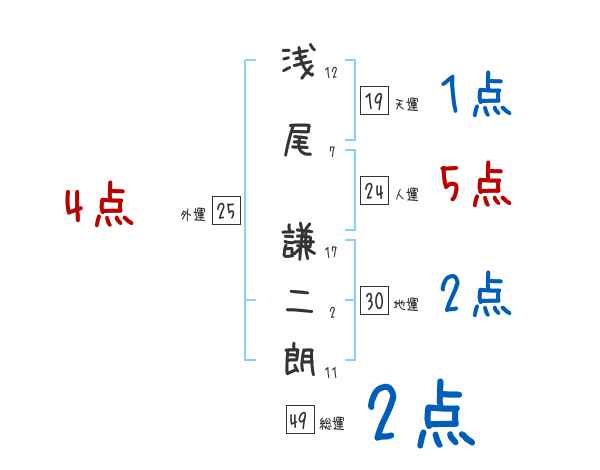 天運![]() | 浅尾謙二朗さんの天運は19画の1つ星!優れた才能を持ちますが、協調性が足りないことも。周りの人と協力する事を意識しましょう。 家系が持つ宿命的な運勢を表します。祖先から受け継いだ苗字ですので自分の力が及びません。家柄を象徴します。 |
