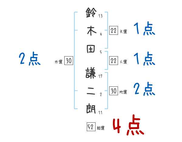 人運![]() | 鈴木田謙二朗さんの人運は22画の1つ星!努力することが苦手ないっぽう手先が器用。芸術性にも優れる。 性格や才能などを表す2番目に重要な運勢です。人間関係や協調性、社会的な成功に影響します。主に20歳から50歳ぐらいまでの中年期の運勢を表します。 |