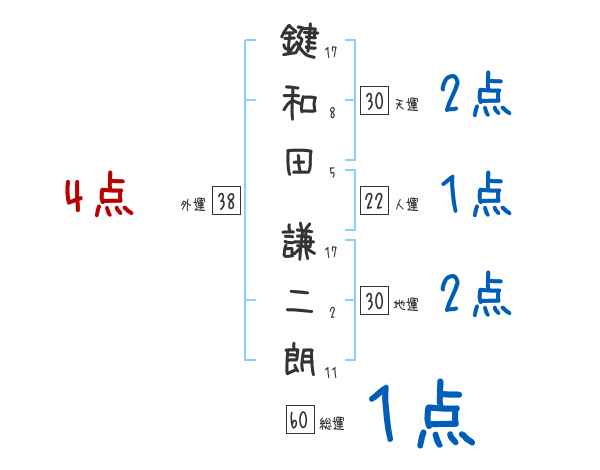 外運![]() | 鍵和田謙二朗さんの外運は38画の4つ星!温厚な性格で技術的な才能を発揮する。職人的な仕事に向いている。 生活面を象徴する運勢です。外部から受ける影響力を表し、結婚運、家庭運や職場、環境への順応性を表します。 |