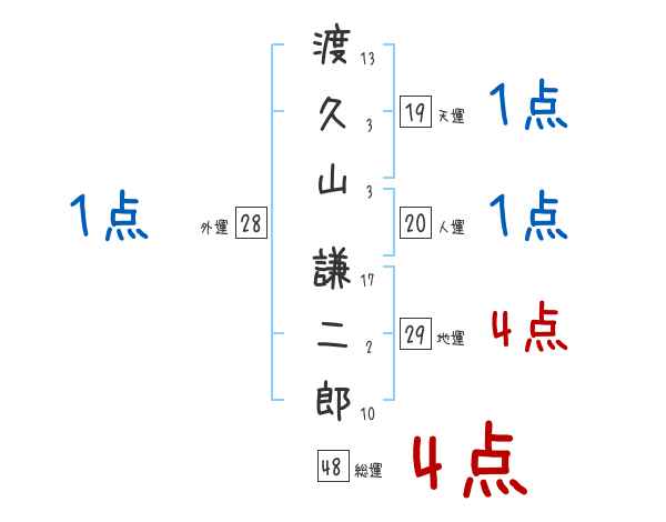 外運![]() | 渡久山謙二郎さんの外運は28画の1つ星!家庭環境に注意。スポーツで活躍できる能力があるかも。 生活面を象徴する運勢です。外部から受ける影響力を表し、結婚運、家庭運や職場、環境への順応性を表します。 |