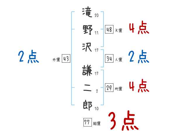 外運![]() | 滝野沢謙二郎さんの外運は43画の2つ星!頑固な性格で独立心が強いかも。やや非現実的で浪費に注意しましょう。 生活面を象徴する運勢です。外部から受ける影響力を表し、結婚運、家庭運や職場、環境への順応性を表します。 |