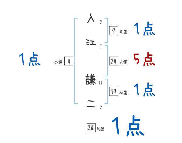 総運![]() | 入江謙二さんの総運は28画の1つ星!家庭環境に注意。スポーツで活躍できる能力があるかも。 あなたの人生を表す1番重要な運勢です。生涯を通じて影響する総合運となり、主に50歳以降の晩年期に影響を及ぼします。 |