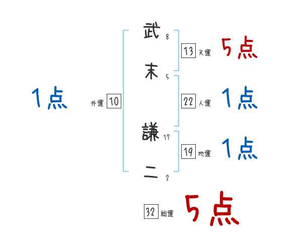 総運![]() | 武末謙二さんの総運は32画の5つ星!柔軟性があり成功する。チャンスが多く金運が良い。 あなたの人生を表す1番重要な運勢です。生涯を通じて影響する総合運となり、主に50歳以降の晩年期に影響を及ぼします。 |