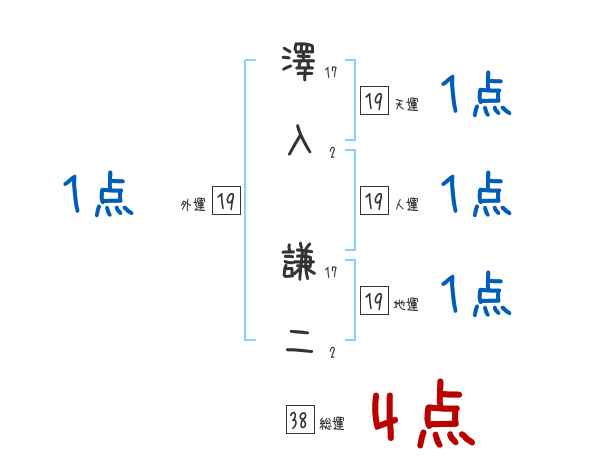 天運![]() | 澤入謙二さんの天運は19画の1つ星!優れた才能を持ちますが、協調性が足りないことも。周りの人と協力する事を意識しましょう。 家系が持つ宿命的な運勢を表します。祖先から受け継いだ苗字ですので自分の力が及びません。家柄を象徴します。 |