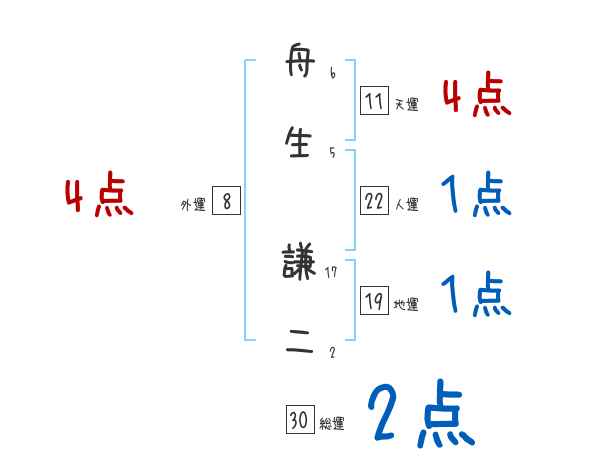 人運![]() | 舟生謙二さんの人運は22画の1つ星!努力することが苦手ないっぽう手先が器用。芸術性にも優れる。 性格や才能などを表す2番目に重要な運勢です。人間関係や協調性、社会的な成功に影響します。主に20歳から50歳ぐらいまでの中年期の運勢を表します。 |
