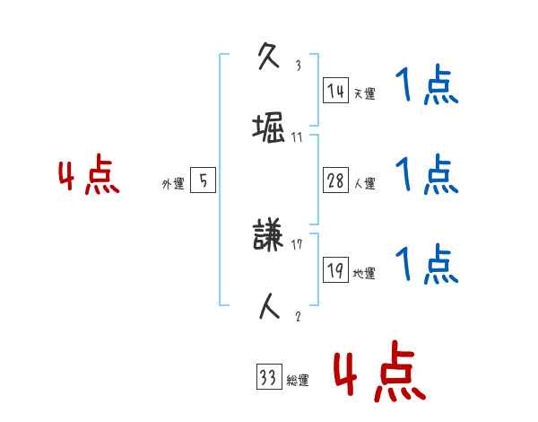 天運![]() | 久堀謙人さんの天運は14画の1つ星!人に対して優しいがストレスを溜め込みがち。人間関係のトラブルを避けるよう気をつけましょう。 家系が持つ宿命的な運勢を表します。祖先から受け継いだ苗字ですので自分の力が及びません。家柄を象徴します。 |