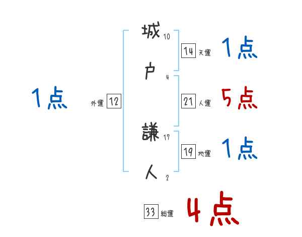 天運![]() | 城戸謙人さんの天運は14画の1つ星!人に対して優しいがストレスを溜め込みがち。人間関係のトラブルを避けるよう気をつけましょう。 家系が持つ宿命的な運勢を表します。祖先から受け継いだ苗字ですので自分の力が及びません。家柄を象徴します。 |