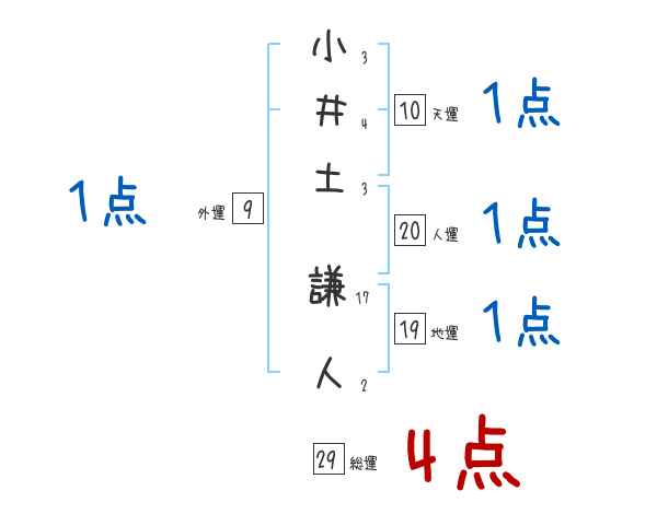 総運![]() | 小井土謙人さんの総運は29画の4つ星!完全主義で才能がある。厳格な心の持ち主。 あなたの人生を表す1番重要な運勢です。生涯を通じて影響する総合運となり、主に50歳以降の晩年期に影響を及ぼします。 |