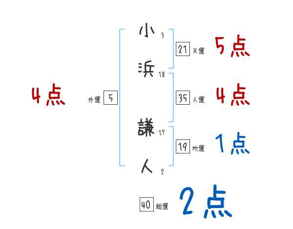 外運![]() | 小浜謙人さんの外運は5画の4つ星!健康で安泰。協調性に優れ、財産に恵まれる。 生活面を象徴する運勢です。外部から受ける影響力を表し、結婚運、家庭運や職場、環境への順応性を表します。 |