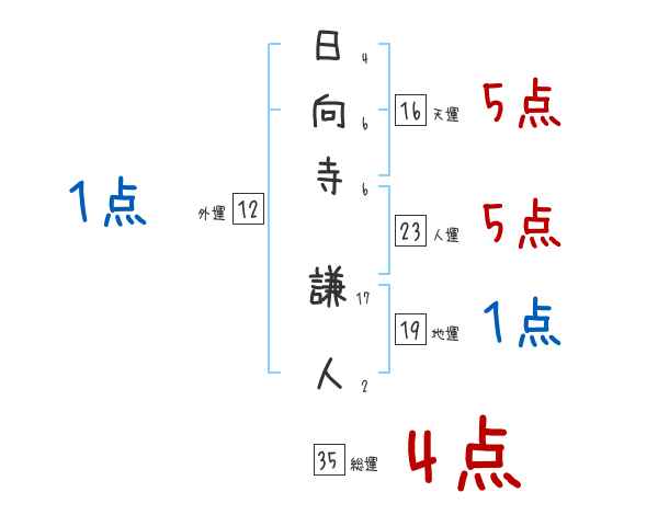 天運![]() | 日向寺謙人さんの天運は16画の5つ星!人望が厚く大きく発展する。逆転成功が見える。 家系が持つ宿命的な運勢を表します。祖先から受け継いだ苗字ですので自分の力が及びません。家柄を象徴します。 |