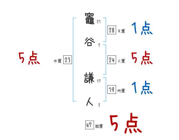 総運![]() | 竈谷謙人さんの総運は47画の5つ星!実力が開花し発展する円満な人生。財に恵まれる。 あなたの人生を表す1番重要な運勢です。生涯を通じて影響する総合運となり、主に50歳以降の晩年期に影響を及ぼします。 |
