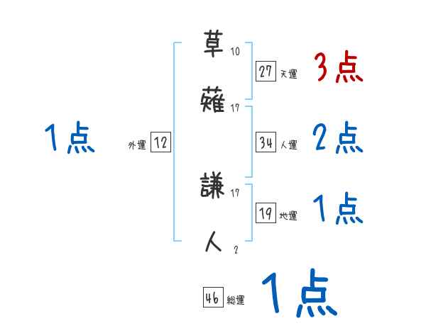 総運![]() | 草薙謙人さんの総運は46画の1つ星!迷走することが多く苦労するかも。目先のことにとらわれないように。 あなたの人生を表す1番重要な運勢です。生涯を通じて影響する総合運となり、主に50歳以降の晩年期に影響を及ぼします。 |