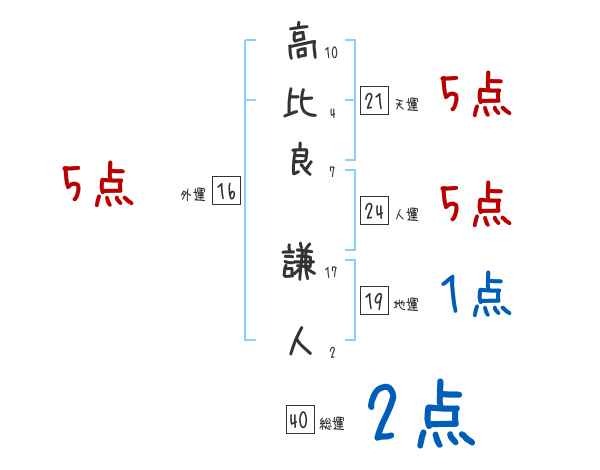 外運![]() | 高比良謙人さんの外運は16画の5つ星!人望が厚く大きく発展する。逆転成功が見える。 生活面を象徴する運勢です。外部から受ける影響力を表し、結婚運、家庭運や職場、環境への順応性を表します。 |