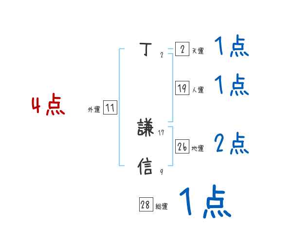 総運![]() | 丁謙信さんの総運は28画の1つ星!家庭環境に注意。スポーツで活躍できる能力があるかも。 あなたの人生を表す1番重要な運勢です。生涯を通じて影響する総合運となり、主に50歳以降の晩年期に影響を及ぼします。 |