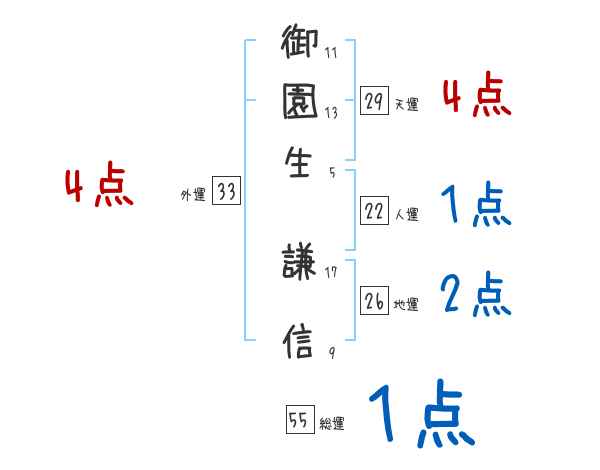 外運![]() | 御園生謙信さんの外運は33画の4つ星!権力志向でプライドが高い。勇気があり運を切り開き成功する。 生活面を象徴する運勢です。外部から受ける影響力を表し、結婚運、家庭運や職場、環境への順応性を表します。 |