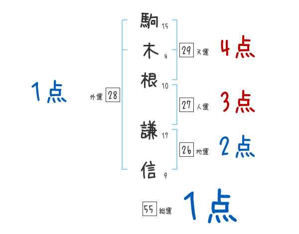 外運![]() | 駒木根謙信さんの外運は28画の1つ星!家庭環境に注意。スポーツで活躍できる能力があるかも。 生活面を象徴する運勢です。外部から受ける影響力を表し、結婚運、家庭運や職場、環境への順応性を表します。 |