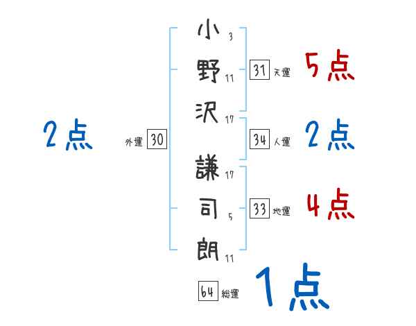 天運![]() | 小野沢謙司朗さんの天運は31画の5つ星!社交性があり判断力に優れる。順風満帆な人生で円満な生活。 家系が持つ宿命的な運勢を表します。祖先から受け継いだ苗字ですので自分の力が及びません。家柄を象徴します。 |