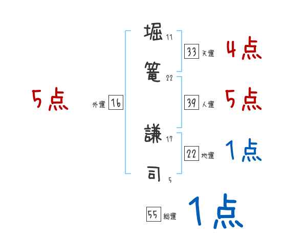 天運![]() | 堀篭謙司さんの天運は33画の4つ星!権力志向でプライドが高い。勇気があり運を切り開き成功する。 家系が持つ宿命的な運勢を表します。祖先から受け継いだ苗字ですので自分の力が及びません。家柄を象徴します。 |