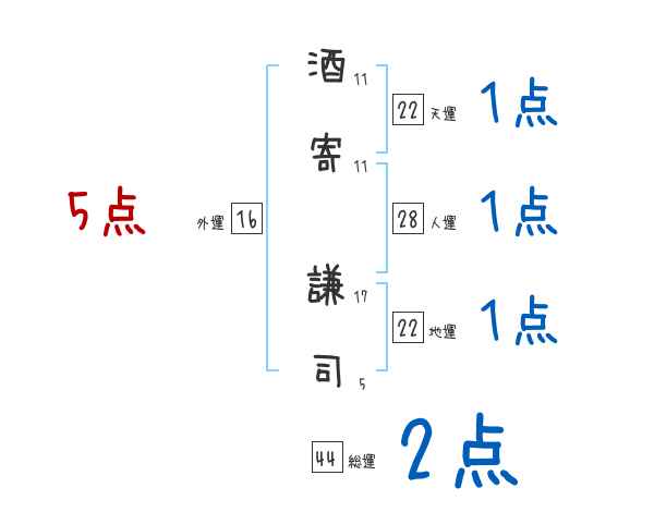 天運![]() | 酒寄謙司さんの天運は22画の1つ星!努力することが苦手ないっぽう手先が器用。芸術性にも優れる。 家系が持つ宿命的な運勢を表します。祖先から受け継いだ苗字ですので自分の力が及びません。家柄を象徴します。 |