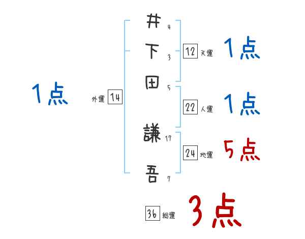 総運![]() | 井下田謙吾さんの総運は36画の3つ星!先見性が豊かです。多少神経質で苦労することも。 あなたの人生を表す1番重要な運勢です。生涯を通じて影響する総合運となり、主に50歳以降の晩年期に影響を及ぼします。 |
