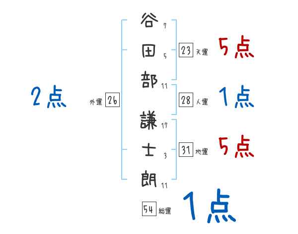 天運![]() | 谷田部謙士朗さんの天運は23画の5つ星!想像力に優れ活力がある。一代で成功し名誉を手に入れる。 家系が持つ宿命的な運勢を表します。祖先から受け継いだ苗字ですので自分の力が及びません。家柄を象徴します。 |