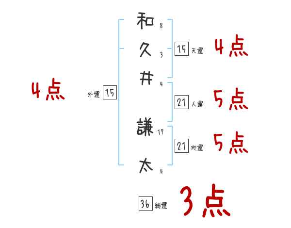 外運![]() | 和久井謙太さんの外運は15画の4つ星!人徳があり出世する。順調に物事を進め円満な人生。 生活面を象徴する運勢です。外部から受ける影響力を表し、結婚運、家庭運や職場、環境への順応性を表します。 |