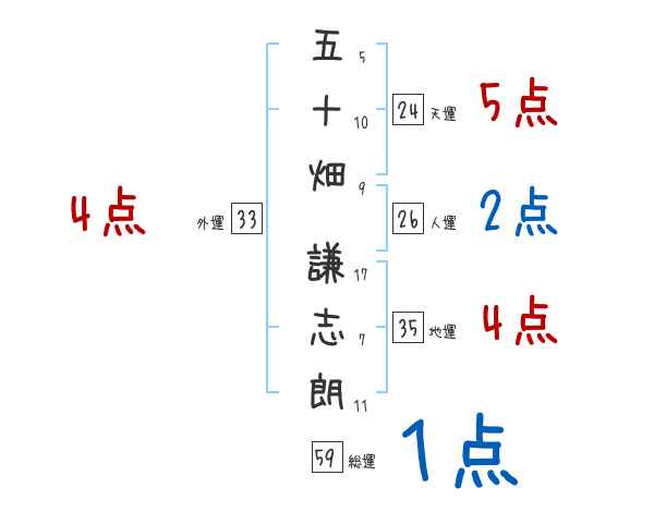 総運![]() | 五十畑謙志朗さんの総運は59画の1つ星!意志の弱さであきらめることが多いかも。粘り強さが必要。 あなたの人生を表す1番重要な運勢です。生涯を通じて影響する総合運となり、主に50歳以降の晩年期に影響を及ぼします。 |