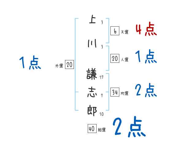 天運![]() | 上川謙志郎さんの天運は6画の4つ星!慎重な努力家で信頼を得る。誠実な精神で向上心に優れる。 家系が持つ宿命的な運勢を表します。祖先から受け継いだ苗字ですので自分の力が及びません。家柄を象徴します。 |