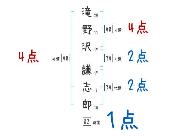 天運![]() | 滝野沢謙志郎さんの天運は48画の4つ星!賢明な性格で人望が厚い。指導力があり多くの人に尊敬される。 家系が持つ宿命的な運勢を表します。祖先から受け継いだ苗字ですので自分の力が及びません。家柄を象徴します。 |