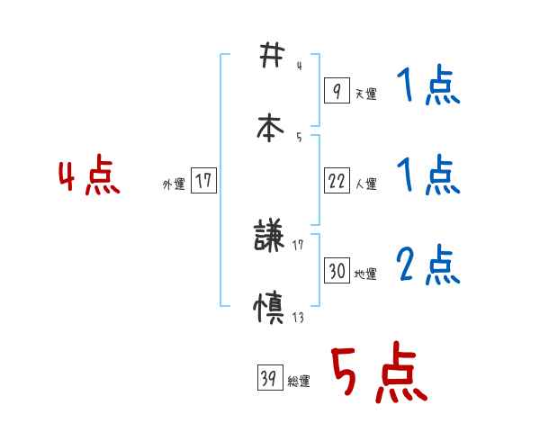 外運![]() | 井本謙慎さんの外運は17画の4つ星!積極的な行動力。地位を気づき財産を手に入れる。純粋な心と直感力。 生活面を象徴する運勢です。外部から受ける影響力を表し、結婚運、家庭運や職場、環境への順応性を表します。 |