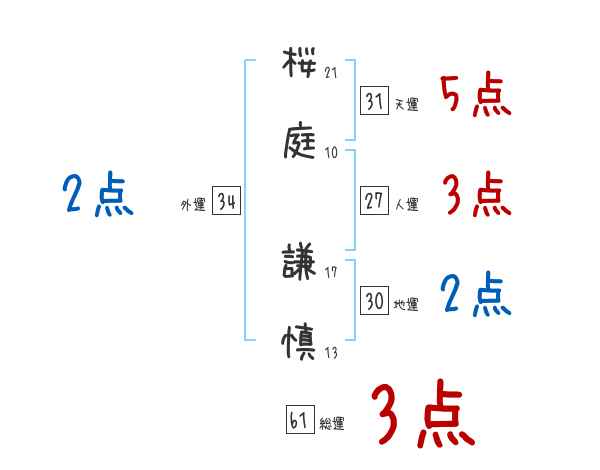外運![]() | 桜庭謙慎さんの外運は34画の2つ星!独創性に優れるが、自尊心が強く災難に注意しましょう。 生活面を象徴する運勢です。外部から受ける影響力を表し、結婚運、家庭運や職場、環境への順応性を表します。 |