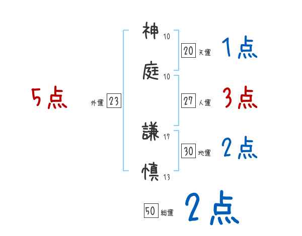 地運![]() | 神庭謙慎さんの地運は30画の2つ星!浮き沈みの激しさに注意しましょう。 個性を表す基礎的な運勢です。性格形成や対人関係、行動力など家庭環境に影響されます。主に誕生してから20歳くらいまでの若年期の運勢を表します。 |