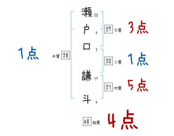 外運![]() | 瀬戸口謙斗さんの外運は28画の1つ星!家庭環境に注意。スポーツで活躍できる能力があるかも。 生活面を象徴する運勢です。外部から受ける影響力を表し、結婚運、家庭運や職場、環境への順応性を表します。 |