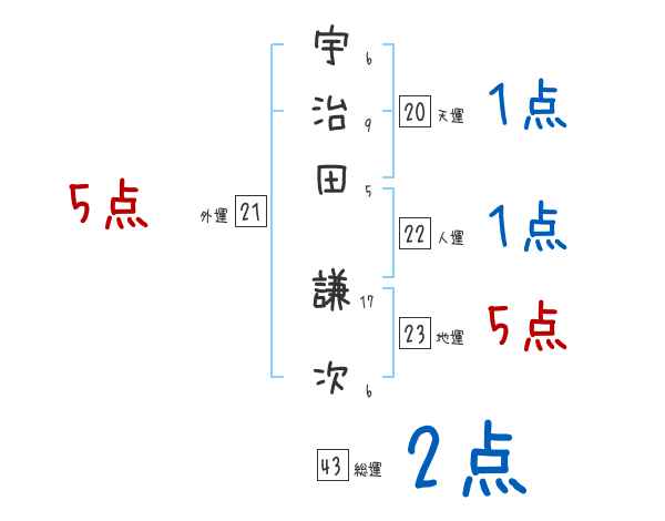総運![]() | 宇治田謙次さんの総運は43画の2つ星!頑固な性格で独立心が強いかも。やや非現実的で浪費に注意しましょう。 あなたの人生を表す1番重要な運勢です。生涯を通じて影響する総合運となり、主に50歳以降の晩年期に影響を及ぼします。 |