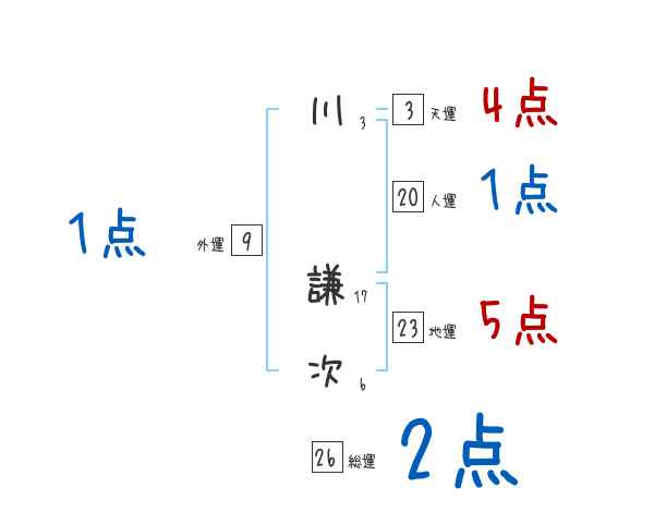 天運![]() | 川謙次さんの天運は3画の4つ星!活動的で才能に恵まれ、多くの信頼を得る。希望に満ち成長する。 家系が持つ宿命的な運勢を表します。祖先から受け継いだ苗字ですので自分の力が及びません。家柄を象徴します。 |