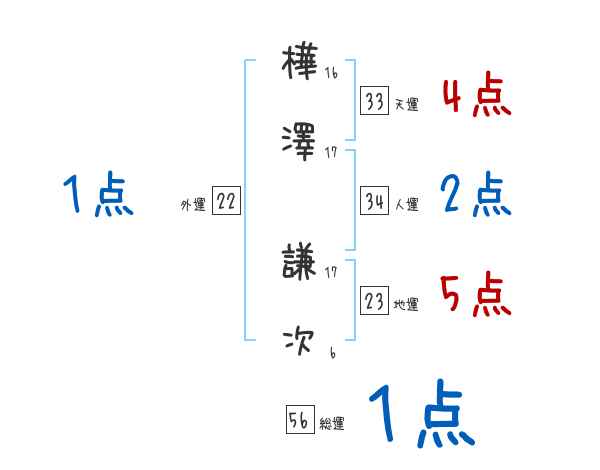 天運![]() | 樺澤謙次さんの天運は33画の4つ星!権力志向でプライドが高い。勇気があり運を切り開き成功する。 家系が持つ宿命的な運勢を表します。祖先から受け継いだ苗字ですので自分の力が及びません。家柄を象徴します。 |