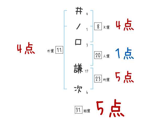 総運![]() | 井ノ口謙次さんの総運は31画の5つ星!社交性があり判断力に優れる。順風満帆な人生で円満な生活。 あなたの人生を表す1番重要な運勢です。生涯を通じて影響する総合運となり、主に50歳以降の晩年期に影響を及ぼします。 |