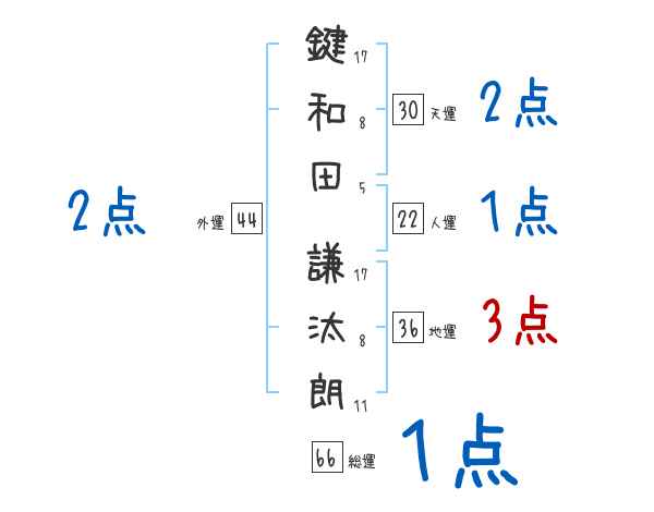 天運![]() | 鍵和田謙汰朗さんの天運は30画の2つ星!浮き沈みの激しさに注意しましょう。 家系が持つ宿命的な運勢を表します。祖先から受け継いだ苗字ですので自分の力が及びません。家柄を象徴します。 |