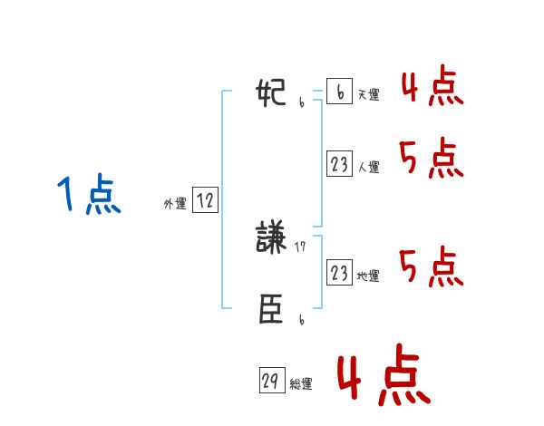 人運![]() | 妃謙臣さんの人運は23画の5つ星!想像力に優れ活力がある。一代で成功し名誉を手に入れる。 性格や才能などを表す2番目に重要な運勢です。人間関係や協調性、社会的な成功に影響します。主に20歳から50歳ぐらいまでの中年期の運勢を表します。 |