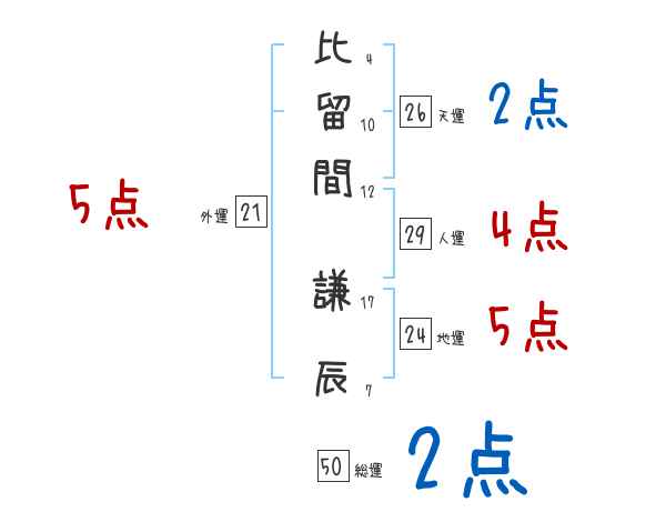 人運![]() | 比留間謙辰さんの人運は29画の4つ星!完全主義で才能がある。厳格な心の持ち主。 性格や才能などを表す2番目に重要な運勢です。人間関係や協調性、社会的な成功に影響します。主に20歳から50歳ぐらいまでの中年期の運勢を表します。 |