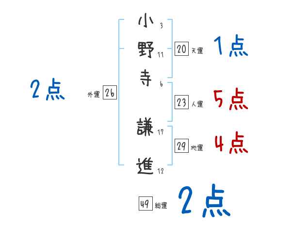 外運![]() | 小野寺謙進さんの外運は26画の2つ星!波瀾万丈かも。信頼できる人を大事にしましょう。 生活面を象徴する運勢です。外部から受ける影響力を表し、結婚運、家庭運や職場、環境への順応性を表します。 |