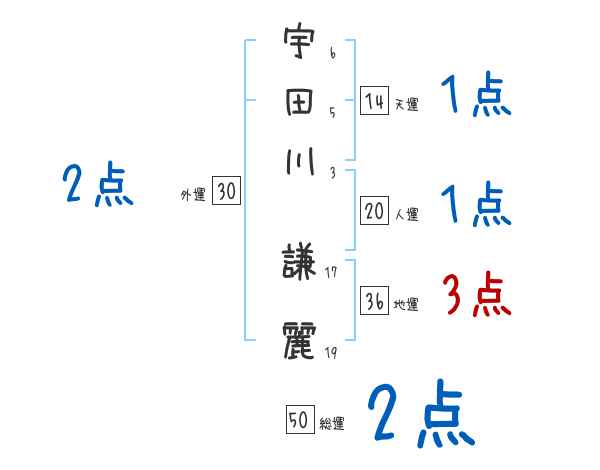 天運![]() | 宇田川謙麗さんの天運は14画の1つ星!人に対して優しいがストレスを溜め込みがち。人間関係のトラブルを避けるよう気をつけましょう。 家系が持つ宿命的な運勢を表します。祖先から受け継いだ苗字ですので自分の力が及びません。家柄を象徴します。 |